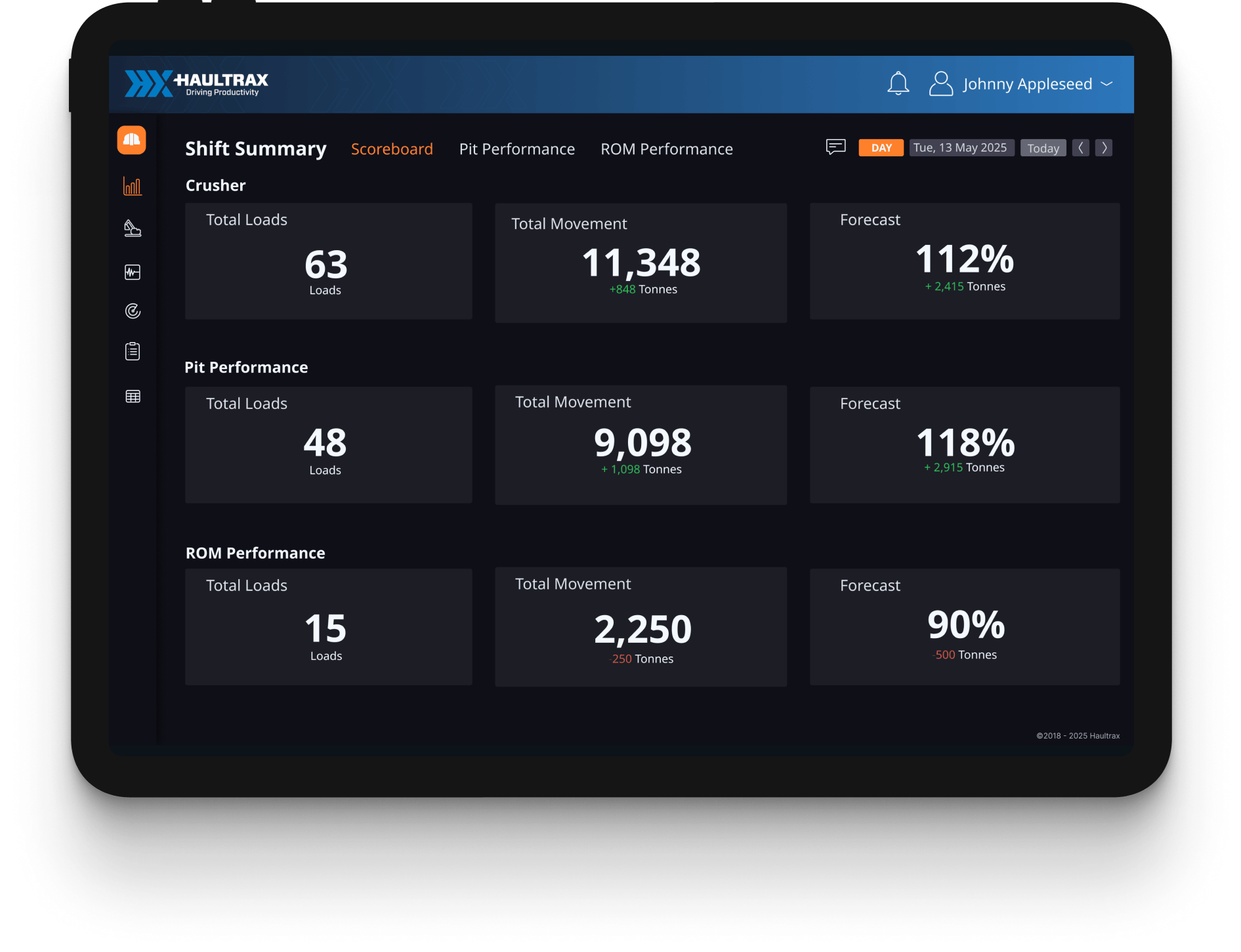The Shift Summary page provides a real-time snapshot of key operational metrics, including total loads, material movements, and forecasted progress. It gives visibility into PIT and ROM performance, helping supervisors, dispatchers, and leaders stay aligned and make informed decisions throughout the shift.
